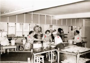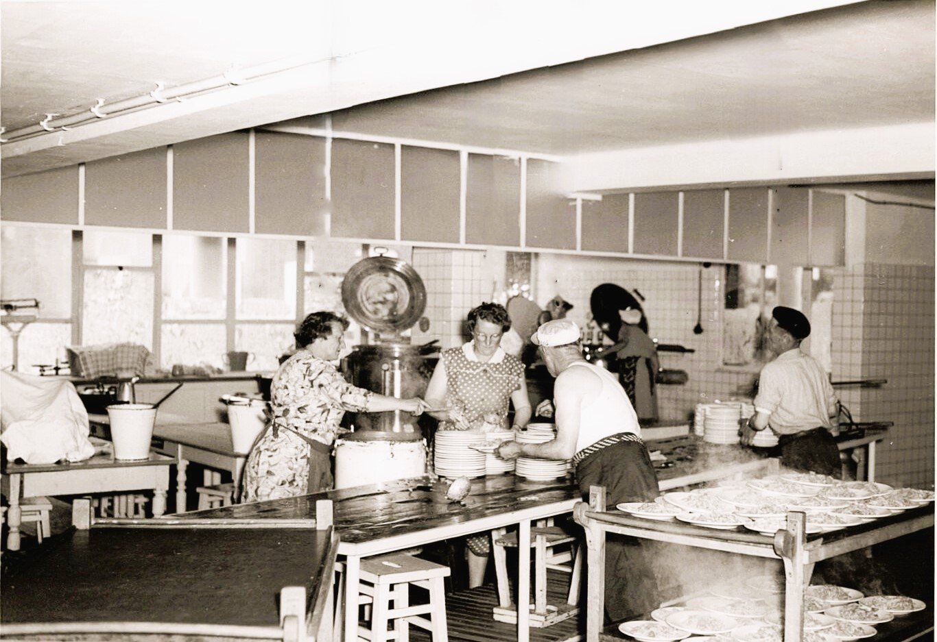 La cuisine du stade lors de la première colonie scolaire. On retrouve sur cette photo : 1 Jeanne Dufrasne, 2 Marthe Lecomte, 3 Gaston Levêque et en 4 Gustave Dequenne.